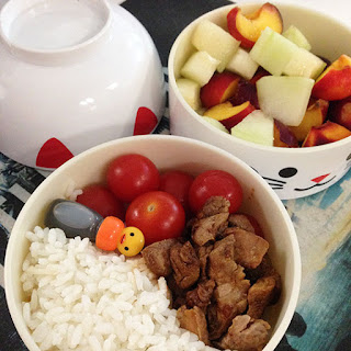 Monday's lunch was basmati rice plus beef, green beans and carrots in oyster sauce (leftovers from Sunday night), plus cherry tomatoes and cucumber as a snack, and today it's what I hope is a more correct rice* with duck in a sweet and slightly spicy soy-heavy sauce, plus cherry tomatoes, and melon and nectarine as a snack. The duck was left over from last night. Already a pattern is developing...